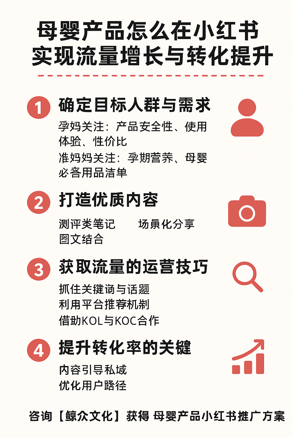 近年來,隨著母嬰行業的持續增長,越來越多品牌選擇小紅書作為重要的推廣陣地。無論是紙尿褲、奶粉,還是嬰兒車、孕產護理用品,都能在小紅書找到高需求用戶群體。對于品牌來說,如何在平臺上精準觸達目標客戶,并實現高效轉化,成為了營銷的關鍵問題。本文將從市場機會、內容打法、流量獲取、轉化路徑到實戰案例全方位解析,幫助母嬰品牌構建完整的小紅書營銷體系。如果你希望獲得更專業的運營支持,可以隨時咨詢 鯨眾文化,我們將為你量身定制推廣方案。